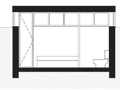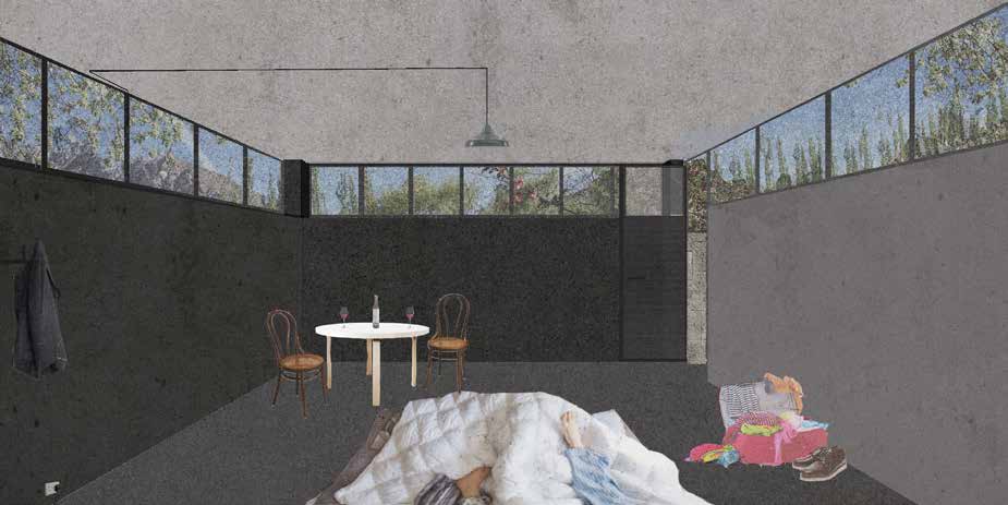 This project was done in the context of a private project for a Client for 2 very simple “gîtes” in the middle of the countryside in the north of Chile, close to Elqui Private programs are concentrated in one single underground space of 5 x 5 meters, making use of the thermal stabilizing mass of the earth, while also containing all the necessary facilities and programs for one or two individuals, storage, etc. The ceiling height of this room is 2.7 meters, with a 1 meter-high window throughout the entire perimeter of the hall, providing natural light, clean air and views to the immediate and extended context. Lighting and sights can be modulated through the use of curtains and opening/closing the windows around the space.