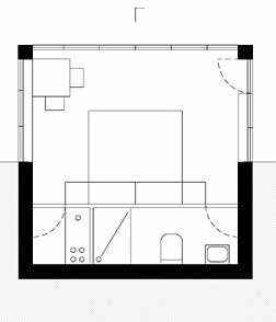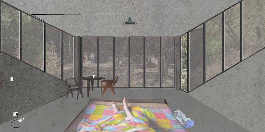 The second lodging is placed next to the river and is very much like the first with the difference that it is not dug into the ground on all sides but on the flank of a hill. Its windows therefore follow the angle of the hill and give a privileged view on the stream at the bottom of the small valley. This unit is placed next to the river crossing the site, over a strip of terrain which is clearly sloped with a 3-meter difference between both levels, which is used to completely bury one of its facades, half of two others and leave one of the sides of the plan completely exposed towards the river, allowing direct views to the water.